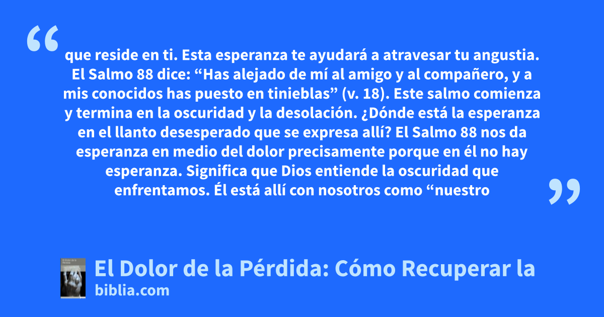 que reside en ti. Esta esperanza te ayudará a atravesar tu angustia. El Salmo 88 dice: “Has alejado de mí al amigo y al compañero, y a mis conocidos has puesto en tinieblas” (v. 18). Este salmo comienza y termina en la oscuridad y la desolación. ¿Dónde está la esperanza en el llanto desesperado que se expresa allí? El Salmo 88 nos da esperanza en medio del dolor precisamente porque en él no hay esperanza. Significa que Dios entiende la oscuridad que enfrentamos. Él está allí con nosotros como “nuestro