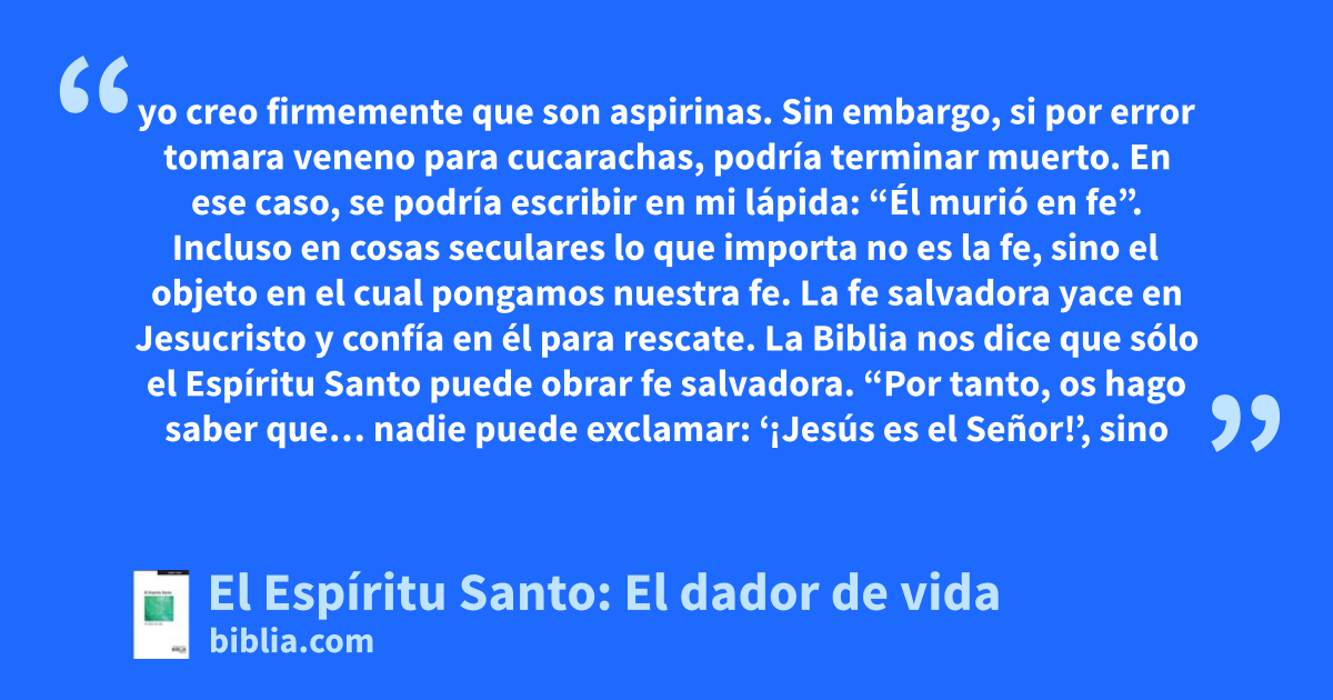 yo creo firmemente que son aspirinas. Sin embargo, si por error tomara veneno para cucarachas, podría terminar muerto. En ese caso, se podría escribir en mi lápida: “Él murió en fe”. Incluso en cosas seculares lo que importa no es la fe, sino el objeto en el cual pongamos nuestra fe. La fe salvadora yace en Jesucristo y confía en él para rescate. La Biblia nos dice que sólo el Espíritu Santo puede obrar fe salvadora. “Por tanto, os hago saber que… nadie puede exclamar: ‘¡Jesús es el Señor!’, sino
