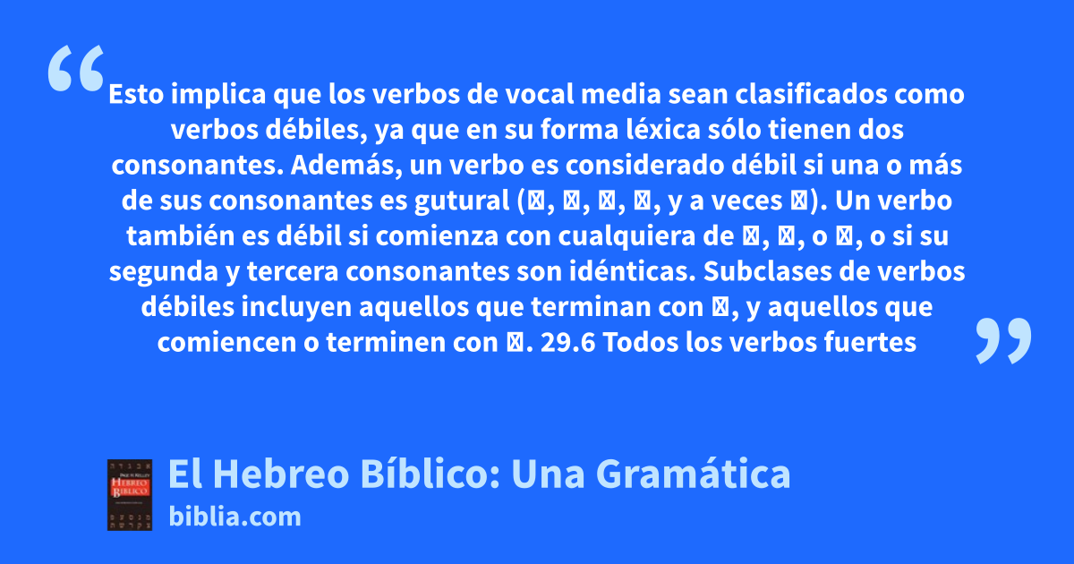 Esto implica que los verbos de vocal media sean clasificados como verbos débiles, ya que en su forma léxica sólo tienen dos consonantes. Además, un verbo es considerado débil si una o más de sus consonantes es gutural (א, ח, ה, ע, y a veces ר). Un verbo también es débil si comienza con cualquiera de י, ו, o נ, o si su segunda y tercera consonantes son idénticas. Subclases de verbos débiles incluyen aquellos que terminan con ה, y aquellos que comiencen o terminen con א. 29.6 Todos los verbos fuertes