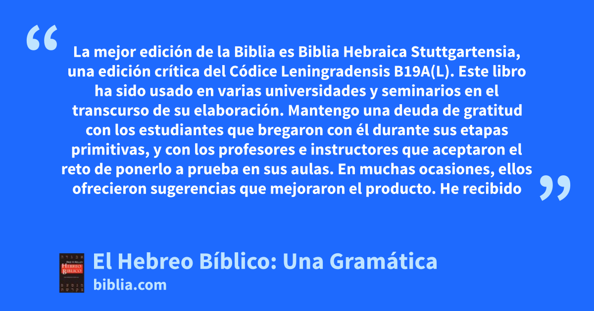 La mejor edición de la Biblia es Biblia Hebraica Stuttgartensia, una edición crítica del Códice Leningradensis B19A(L). Este libro ha sido usado en varias universidades y seminarios en el transcurso de su elaboración. Mantengo una deuda de gratitud con los estudiantes que bregaron con él durante sus etapas primitivas, y con los profesores e instructores que aceptaron el reto de ponerlo a prueba en sus aulas. En muchas ocasiones, ellos ofrecieron sugerencias que mejoraron el producto. He recibido