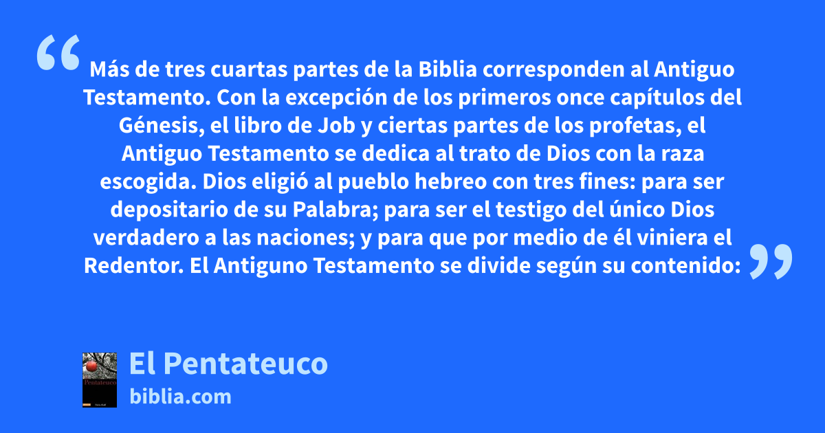 Más de tres cuartas partes de la Biblia corresponden al Antiguo Testamento. Con la excepción de los primeros once capítulos del Génesis, el libro de Job y ciertas partes de los profetas, el Antiguo Testamento se dedica al trato de Dios con la raza escogida. Dios eligió al pueblo hebreo con tres fines: para ser depositario de su Palabra; para ser el testigo del único Dios verdadero a las naciones; y para que por medio de él viniera el Redentor. El Antiguno Testamento se divide según su contenido: