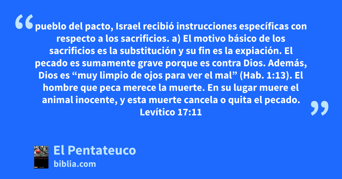 pueblo del pacto, Israel recibió instrucciones específicas con respecto a los sacrificios. a) El motivo básico de los sacrificios es la substitución y su fin es la expiación. El pecado es sumamente grave porque es contra Dios. Además, Dios es “muy limpio de ojos para ver el mal” (Hab. 1:13). El hombre que peca merece la muerte. En su lugar muere el animal inocente, y esta muerte cancela o quita el pecado. Levítico 17:11