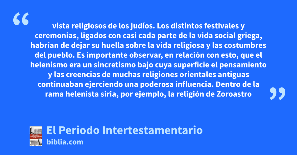 vista religiosos de los judíos. Los distintos festivales y ceremonias, ligados con casi cada parte de la vida social griega, habrían de dejar su huella sobre la vida religiosa y las costumbres del pueblo. Es importante observar, en relación con esto, que el helenismo era un sincretismo bajo cuya superficie el pensamiento y las creencias de muchas religiones orientales antiguas continuaban ejerciendo una poderosa influencia. Dentro de la rama helenista siria, por ejemplo, la religión de Zoroastro