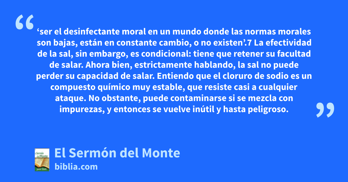 ‘ser el desinfectante moral en un mundo donde las normas morales son bajas, están en constante cambio, o no existen’.7 La efectividad de la sal, sin embargo, es condicional: tiene que retener su facultad de salar. Ahora bien, estrictamente hablando, la sal no puede perder su capacidad de salar. Entiendo que el cloruro de sodio es un compuesto químico muy estable, que resiste casi a cualquier ataque. No obstante, puede contaminarse si se mezcla con impurezas, y entonces se vuelve inútil y hasta peligroso.