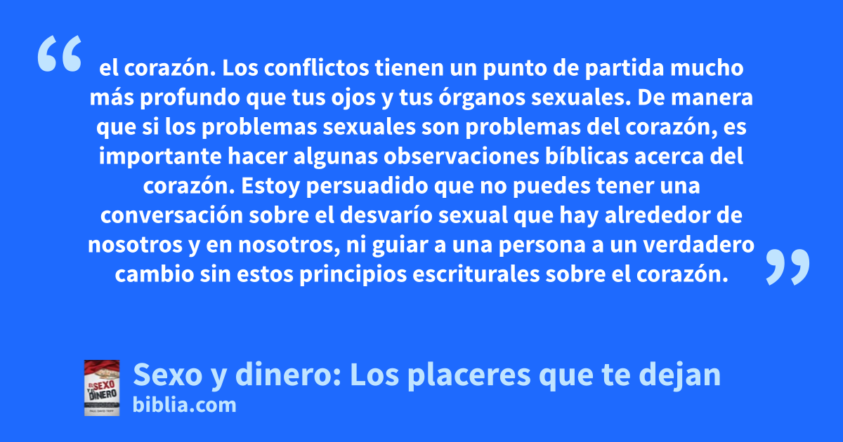 el corazón. Los conflictos tienen un punto de partida mucho más profundo que tus ojos y tus órganos sexuales. De manera que si los problemas sexuales son problemas del corazón, es importante hacer algunas observaciones bíblicas acerca del corazón. Estoy persuadido que no puedes tener una conversación sobre el desvarío sexual que hay alrededor de nosotros y en nosotros, ni guiar a una persona a un verdadero cambio sin estos principios escriturales sobre el corazón.