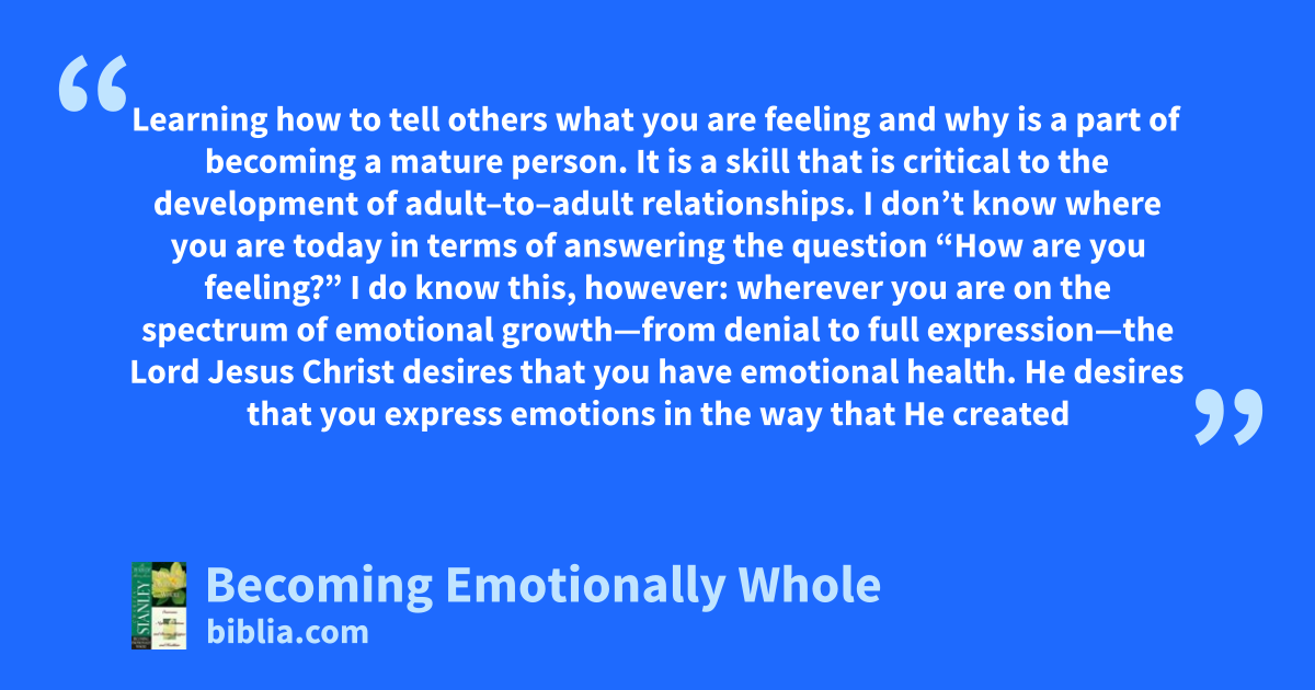Learning how to tell others what you are feeling and why is a part of becoming a mature person. It is a skill that is critical to the development of adult–to–adult relationships. I don’t know where you are today in terms of answering the question “How are you feeling?” I do know this, however: wherever you are on the spectrum of emotional growth—from denial to full expression—the Lord Jesus Christ desires that you have emotional health. He desires that you express emotions in the way that He created