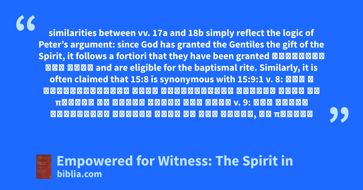 similarities between vv. 17a and 18b simply reflect the logic of Peter’s argument: since God has granted the Gentiles the gift of the Spirit, it follows a fortiori that they have been granted μετάνοια εἰς ζωήν and are eligible for the baptismal rite. Similarly, it is often claimed that 15:8 is synonymous with 15:9:1 v. 8: καὶ ὁ καρδιογνώστης θεὸς ἐμαρτύρηωεν αὐτοῖς δοὺς τὸ πνεῦμα τὸ ἅγιον καθὼς καὶ ἡμῖν v. 9: καὶ θὐθὲν διέκρινεν μεταξὺ ἡμῶν τε καὶ αὐτῶν, τῇ πίστει