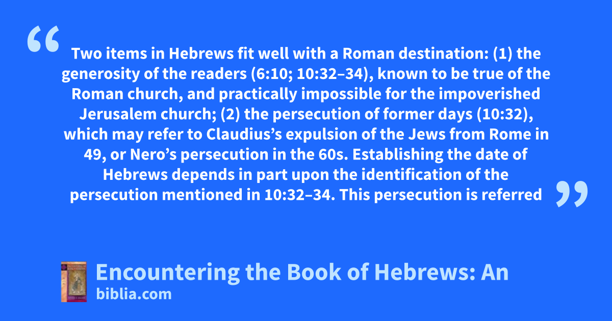 Two items in Hebrews fit well with a Roman destination: (1) the generosity of the readers (6:10; 10:32–34), known to be true of the Roman church, and practically impossible for the impoverished Jerusalem church; (2) the persecution of former days (10:32), which may refer to Claudius’s expulsion of the Jews from Rome in 49, or Nero’s persecution in the 60s. Establishing the date of Hebrews depends in part upon the identification of the persecution mentioned in 10:32–34. This persecution is referred