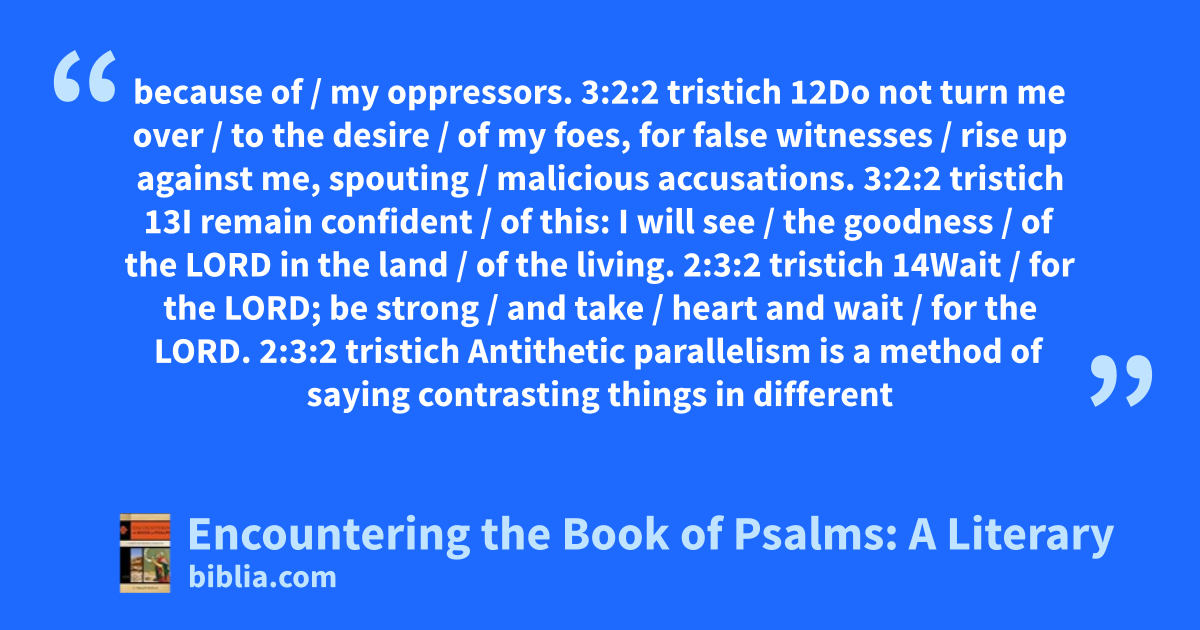 because of / my oppressors. 3:2:2 tristich 12Do not turn me over / to the desire / of my foes, for false witnesses / rise up against me, spouting / malicious accusations. 3:2:2 tristich 13I remain confident / of this: I will see / the goodness / of the LORD in the land / of the living. 2:3:2 tristich 14Wait / for the LORD; be strong / and take / heart and wait / for the LORD. 2:3:2 tristich Antithetic parallelism is a method of saying contrasting things in different