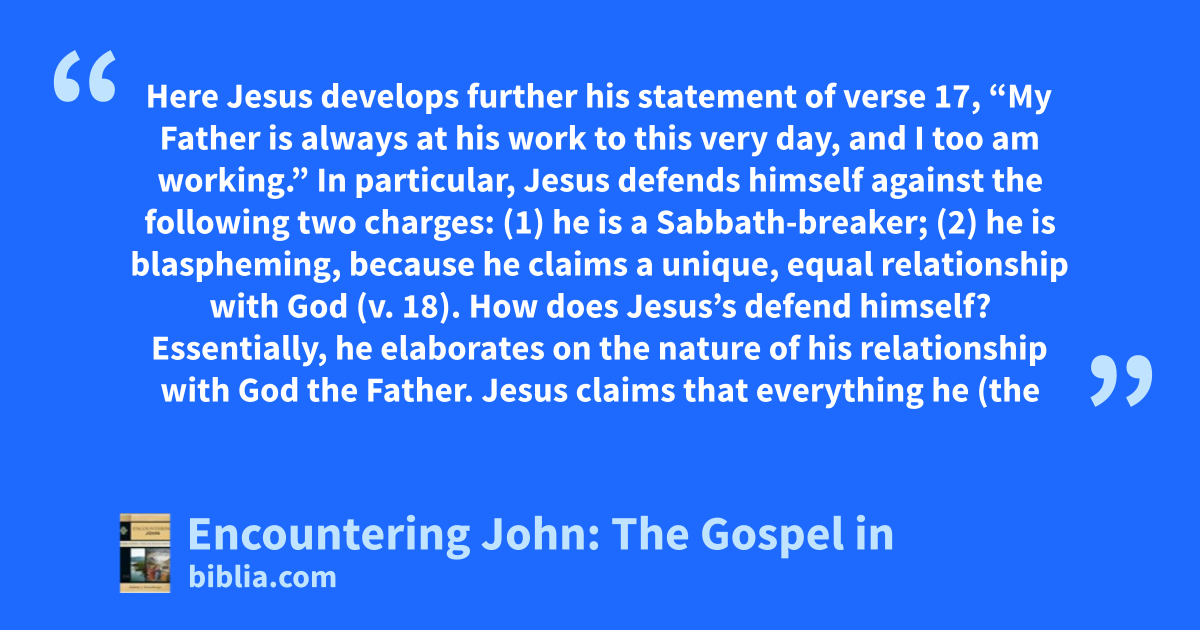 Here Jesus develops further his statement of verse 17, “My Father is always at his work to this very day, and I too am working.” In particular, Jesus defends himself against the following two charges: (1) he is a Sabbath-breaker; (2) he is blaspheming, because he claims a unique, equal relationship with God (v. 18). How does Jesus’s defend himself? Essentially, he elaborates on the nature of his relationship with God the Father. Jesus claims that everything he (the