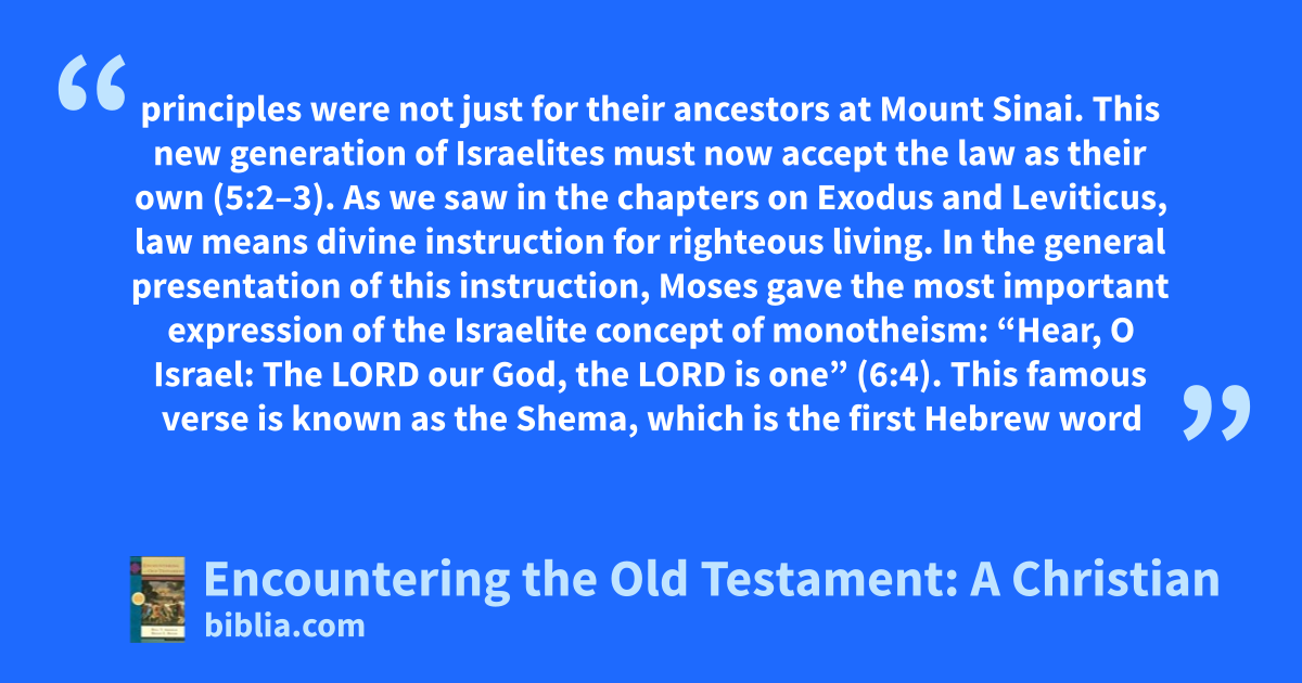 principles were not just for their ancestors at Mount Sinai. This new generation of Israelites must now accept the law as their own (5:2–3). As we saw in the chapters on Exodus and Leviticus, law means divine instruction for righteous living. In the general presentation of this instruction, Moses gave the most important expression of the Israelite concept of monotheism: “Hear, O Israel: The LORD our God, the LORD is one” (6:4). This famous verse is known as the Shema, which is the first Hebrew word