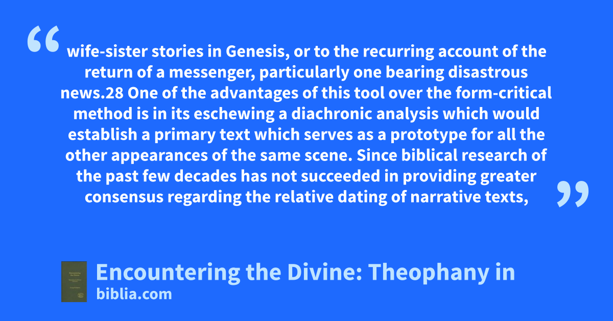 wife-sister stories in Genesis, or to the recurring account of the return of a messenger, particularly one bearing disastrous news.28 One of the advantages of this tool over the form-critical method is in its eschewing a diachronic analysis which would establish a primary text which serves as a prototype for all the other appearances of the same scene. Since biblical research of the past few decades has not succeeded in providing greater consensus regarding the relative dating of narrative texts,
