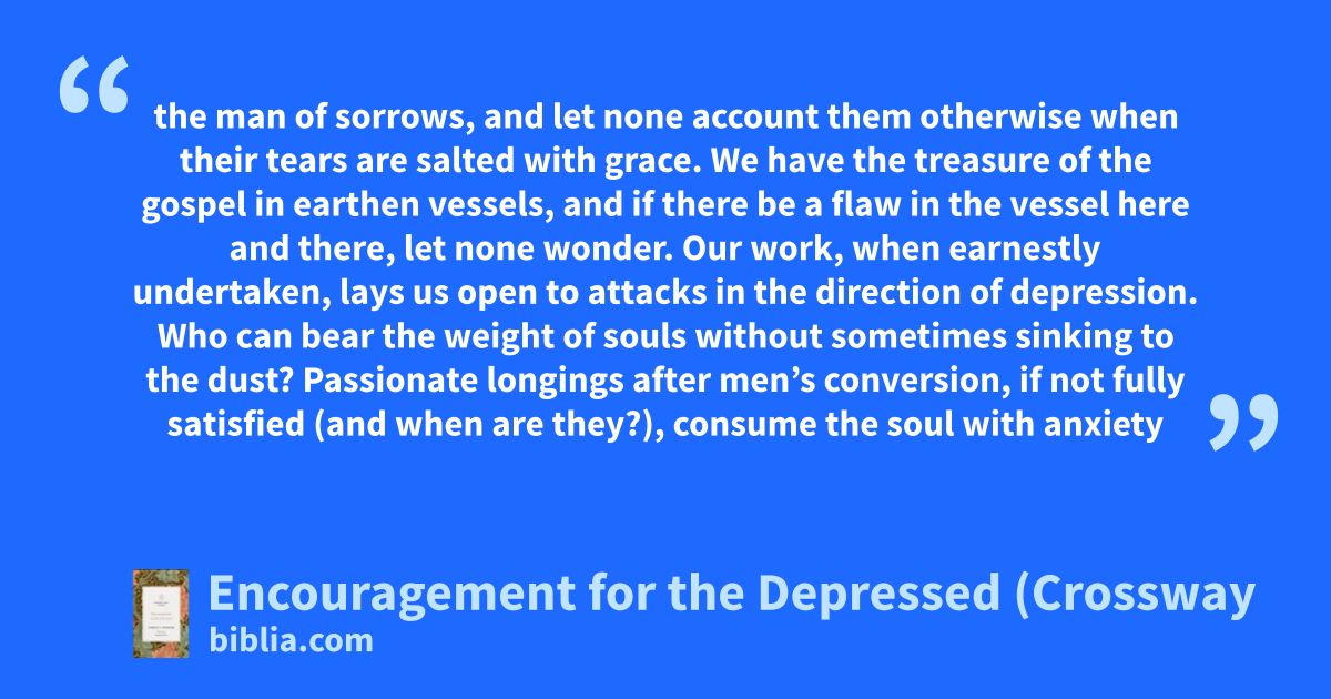 the man of sorrows, and let none account them otherwise when their tears are salted with grace. We have the treasure of the gospel in earthen vessels, and if there be a flaw in the vessel here and there, let none wonder. Our work, when earnestly undertaken, lays us open to attacks in the direction of depression. Who can bear the weight of souls without sometimes sinking to the dust? Passionate longings after men’s conversion, if not fully satisfied (and when are they?), consume the soul with anxiety