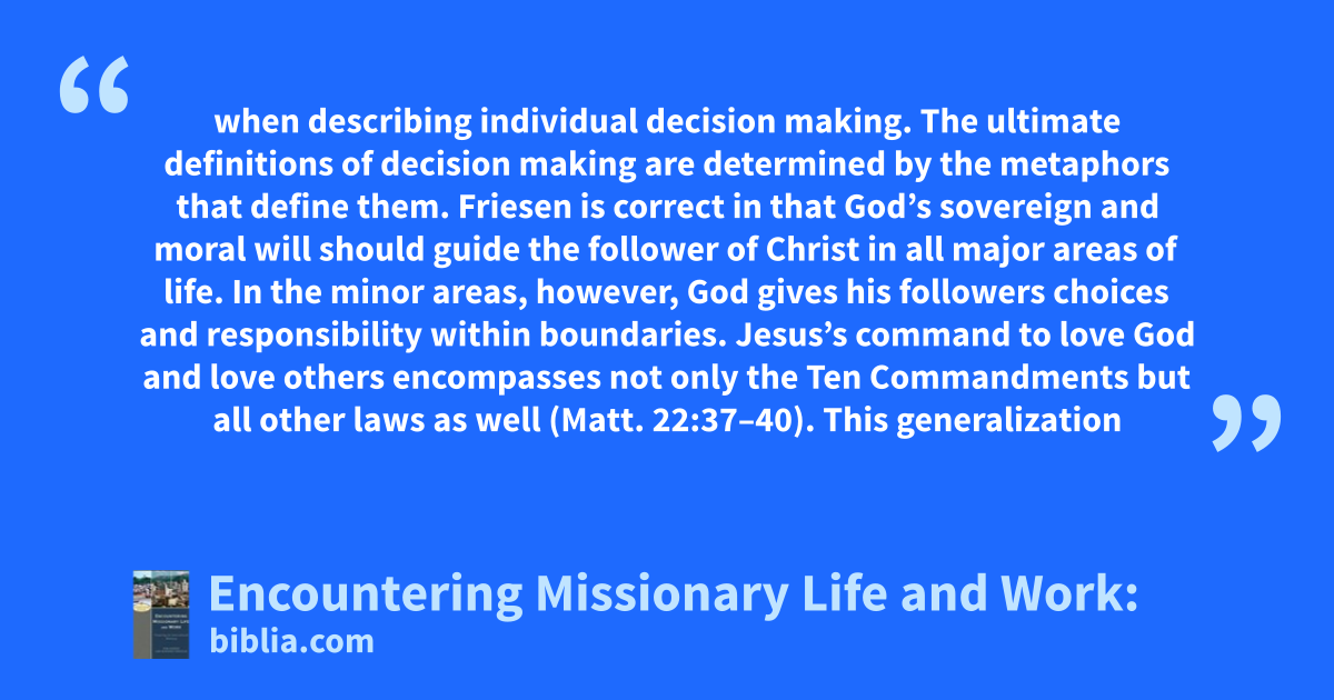 when describing individual decision making. The ultimate definitions of decision making are determined by the metaphors that define them. Friesen is correct in that God’s sovereign and moral will should guide the follower of Christ in all major areas of life. In the minor areas, however, God gives his followers choices and responsibility within boundaries. Jesus’s command to love God and love others encompasses not only the Ten Commandments but all other laws as well (Matt. 22:37–40). This generalization