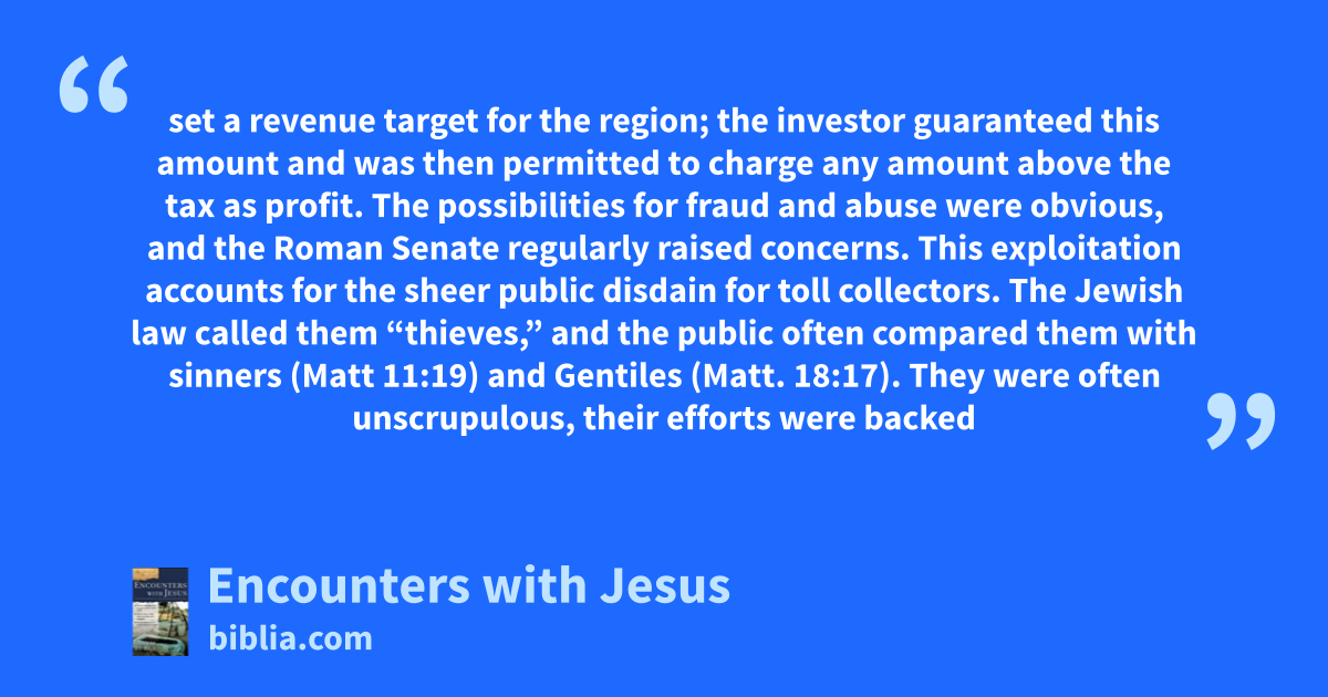 set a revenue target for the region; the investor guaranteed this amount and was then permitted to charge any amount above the tax as profit. The possibilities for fraud and abuse were obvious, and the Roman Senate regularly raised concerns. This exploitation accounts for the sheer public disdain for toll collectors. The Jewish law called them “thieves,” and the public often compared them with sinners (Matt 11:19) and Gentiles (Matt. 18:17). They were often unscrupulous, their efforts were backed
