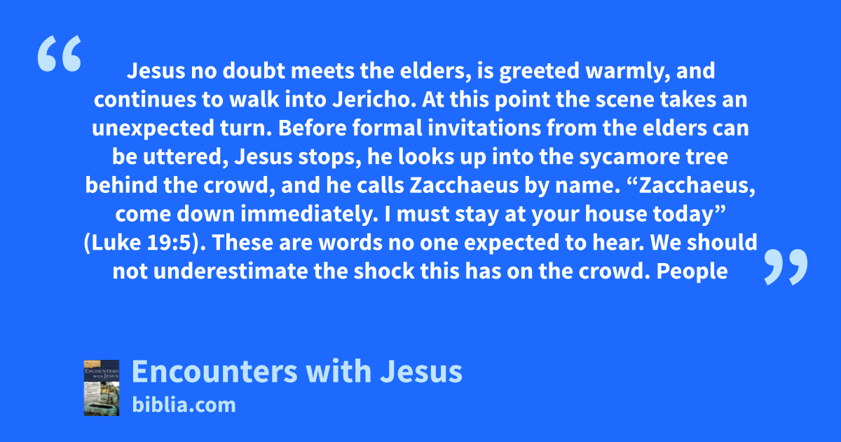 Jesus no doubt meets the elders, is greeted warmly, and continues to walk into Jericho. At this point the scene takes an unexpected turn. Before formal invitations from the elders can be uttered, Jesus stops, he looks up into the sycamore tree behind the crowd, and he calls Zacchaeus by name. “Zacchaeus, come down immediately. I must stay at your house today” (Luke 19:5). These are words no one expected to hear. We should not underestimate the shock this has on the crowd. People