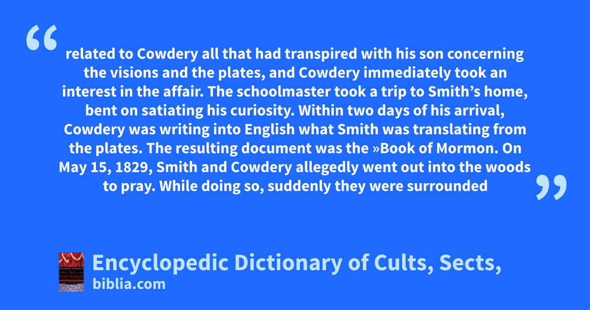 related to Cowdery all that had transpired with his son concerning the visions and the plates, and Cowdery immediately took an interest in the affair. The schoolmaster took a trip to Smith’s home, bent on satiating his curiosity. Within two days of his arrival, Cowdery was writing into English what Smith was translating from the plates. The resulting document was the »Book of Mormon. On May 15, 1829, Smith and Cowdery allegedly went out into the woods to pray. While doing so, suddenly they were surrounded