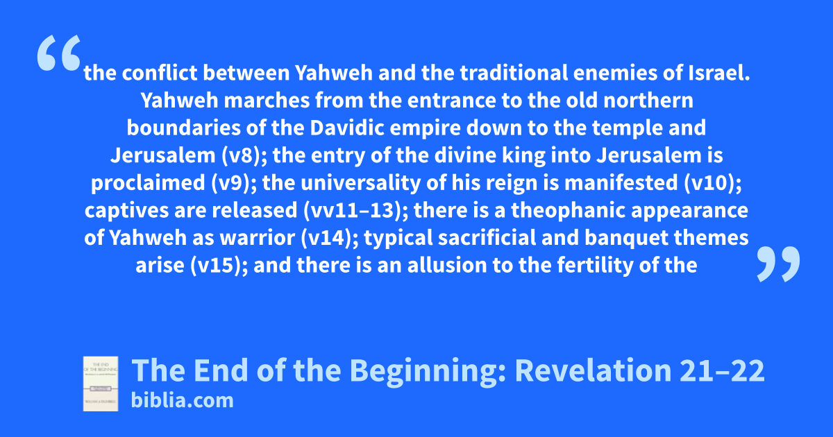 the conflict between Yahweh and the traditional enemies of Israel. Yahweh marches from the entrance to the old northern boundaries of the Davidic empire down to the temple and Jerusalem (v8); the entry of the divine king into Jerusalem is proclaimed (v9); the universality of his reign is manifested (v10); captives are released (vv11–13); there is a theophanic appearance of Yahweh as warrior (v14); typical sacrificial and banquet themes arise (v15); and there is an allusion to the fertility of the