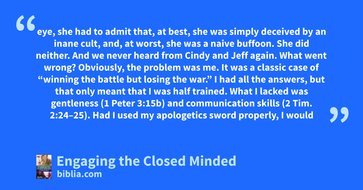 eye, she had to admit that, at best, she was simply deceived by an inane cult, and, at worst, she was a naive buffoon. She did neither. And we never heard from Cindy and Jeff again. What went wrong? Obviously, the problem was me. It was a classic case of “winning the battle but losing the war.” I had all the answers, but that only meant that I was half trained. What I lacked was gentleness (1 Peter 3:15b) and communication skills (2 Tim. 2:24–25). Had I used my apologetics sword properly, I would