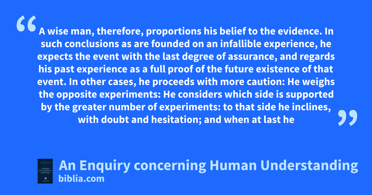 A wise man, therefore, proportions his belief to the evidence. In such conclusions as are founded on an infallible experience, he expects the event with the last degree of assurance, and regards his past experience as a full proof of the future existence of that event. In other cases, he proceeds with more caution: He weighs the opposite experiments: He considers which side is supported by the greater number of experiments: to that side he inclines, with doubt and hesitation; and when at last he