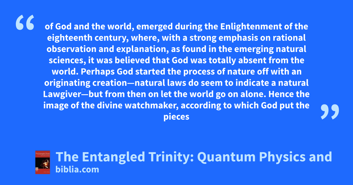 of God and the world, emerged during the Enlightenment of the eighteenth century, where, with a strong emphasis on rational observation and explanation, as found in the emerging natural sciences, it was believed that God was totally absent from the world. Perhaps God started the process of nature off with an originating creation—natural laws do seem to indicate a natural Lawgiver—but from then on let the world go on alone. Hence the image of the divine watchmaker, according to which God put the pieces