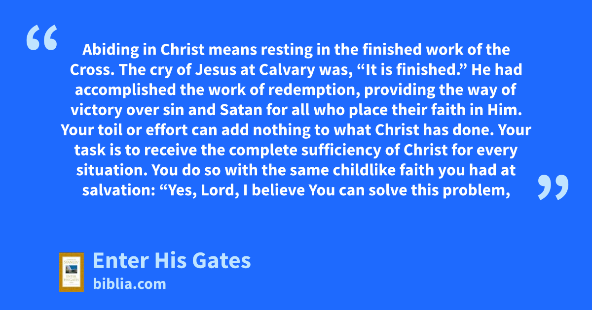 Abiding in Christ means resting in the finished work of the Cross. The cry of Jesus at Calvary was, “It is finished.” He had accomplished the work of redemption, providing the way of victory over sin and Satan for all who place their faith in Him. Your toil or effort can add nothing to what Christ has done. Your task is to receive the complete sufficiency of Christ for every situation. You do so with the same childlike faith you had at salvation: “Yes, Lord, I believe You can solve this problem,