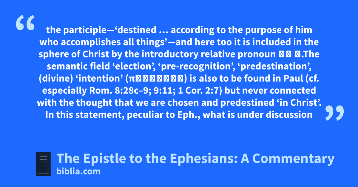 the participle—‘destined … according to the purpose of him who accomplishes all things’—and here too it is included in the sphere of Christ by the introductory relative pronoun ἐν ᾧ.The semantic field ‘election’, ‘pre-recognition’, ‘predestination’, (divine) ‘intention’ (πρόθεσις) is also to be found in Paul (cf. especially Rom. 8:28c–9; 9:11; 1 Cor. 2:7) but never connected with the thought that we are chosen and predestined ‘in Christ’. In this statement, peculiar to Eph., what is under discussion