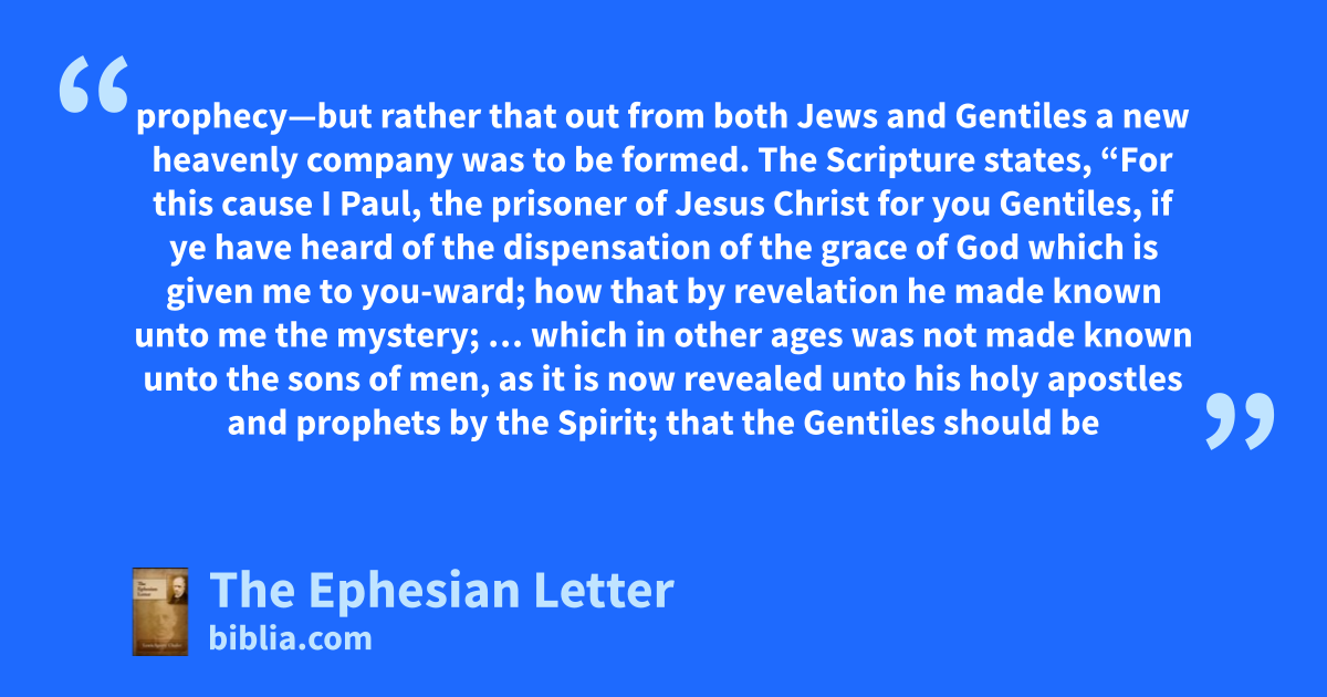 prophecy—but rather that out from both Jews and Gentiles a new heavenly company was to be formed. The Scripture states, “For this cause I Paul, the prisoner of Jesus Christ for you Gentiles, if ye have heard of the dispensation of the grace of God which is given me to you-ward; how that by revelation he made known unto me the mystery; … which in other ages was not made known unto the sons of men, as it is now revealed unto his holy apostles and prophets by the Spirit; that the Gentiles should be
