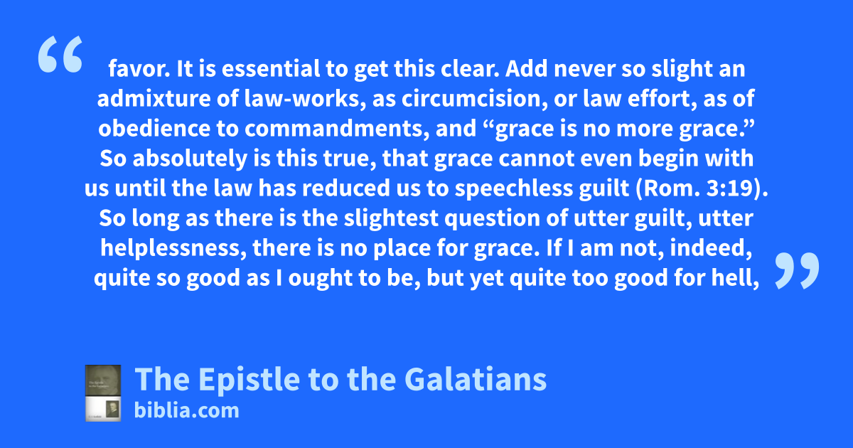 favor. It is essential to get this clear. Add never so slight an admixture of law-works, as circumcision, or law effort, as of obedience to commandments, and “grace is no more grace.” So absolutely is this true, that grace cannot even begin with us until the law has reduced us to speechless guilt (Rom. 3:19). So long as there is the slightest question of utter guilt, utter helplessness, there is no place for grace. If I am not, indeed, quite so good as I ought to be, but yet quite too good for hell,