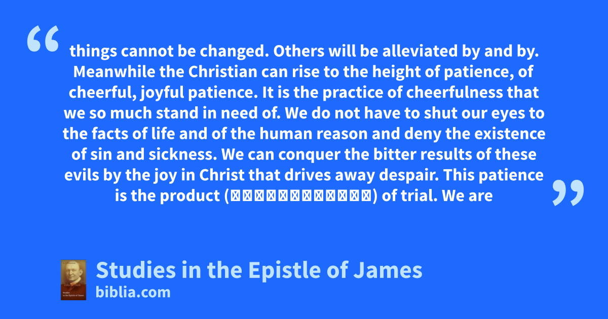 things cannot be changed. Others will be alleviated by and by. Meanwhile the Christian can rise to the height of patience, of cheerful, joyful patience. It is the practice of cheerfulness that we so much stand in need of. We do not have to shut our eyes to the facts of life and of the human reason and deny the existence of sin and sickness. We can conquer the bitter results of these evils by the joy in Christ that drives away despair. This patience is the product (κατεργάζεται) of trial. We are