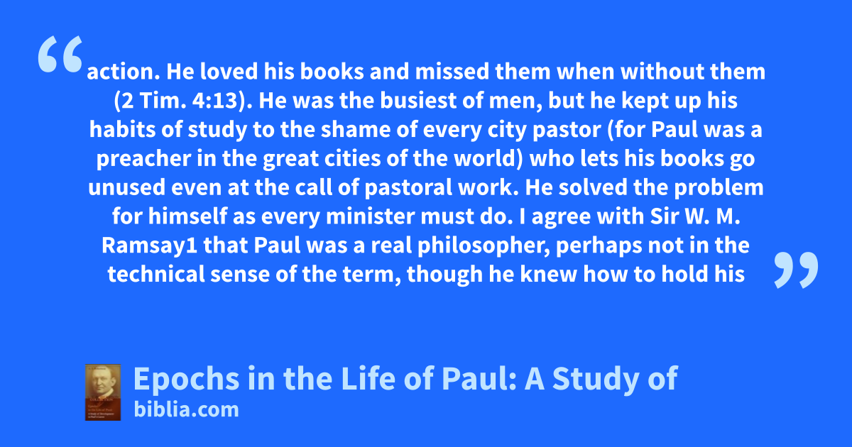 action. He loved his books and missed them when without them (2 Tim. 4:13). He was the busiest of men, but he kept up his habits of study to the shame of every city pastor (for Paul was a preacher in the great cities of the world) who lets his books go unused even at the call of pastoral work. He solved the problem for himself as every minister must do. I agree with Sir W. M. Ramsay1 that Paul was a real philosopher, perhaps not in the technical sense of the term, though he knew how to hold his