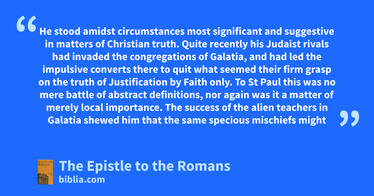 He stood amidst circumstances most significant and suggestive in matters of Christian truth. Quite recently his Judaist rivals had invaded the congregations of Galatia, and had led the impulsive converts there to quit what seemed their firm grasp on the truth of Justification by Faith only. To St Paul this was no mere battle of abstract definitions, nor again was it a matter of merely local importance. The success of the alien teachers in Galatia shewed him that the same specious mischiefs might