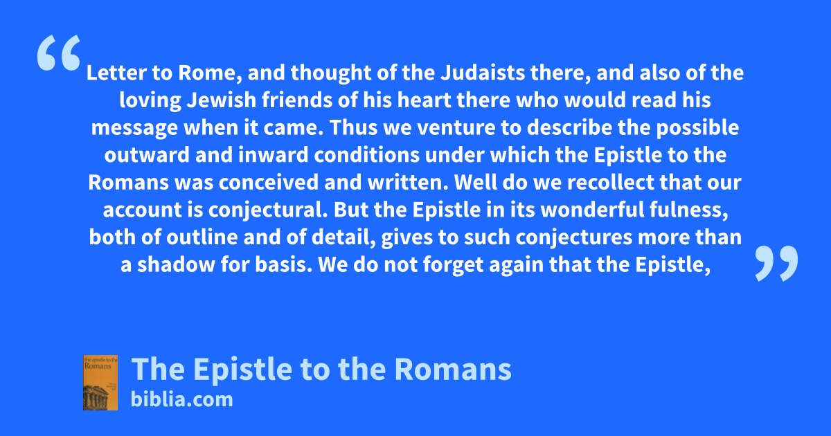 Letter to Rome, and thought of the Judaists there, and also of the loving Jewish friends of his heart there who would read his message when it came. Thus we venture to describe the possible outward and inward conditions under which the Epistle to the Romans was conceived and written. Well do we recollect that our account is conjectural. But the Epistle in its wonderful fulness, both of outline and of detail, gives to such conjectures more than a shadow for basis. We do not forget again that the Epistle,