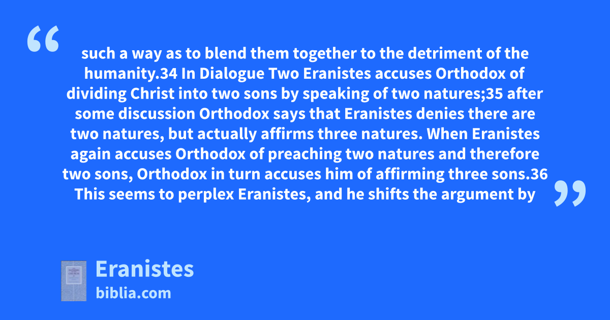 such a way as to blend them together to the detriment of the humanity.34 In Dialogue Two Eranistes accuses Orthodox of dividing Christ into two sons by speaking of two natures;35 after some discussion Orthodox says that Eranistes denies there are two natures, but actually affirms three natures. When Eranistes again accuses Orthodox of preaching two natures and therefore two sons, Orthodox in turn accuses him of affirming three sons.36 This seems to perplex Eranistes, and he shifts the argument by