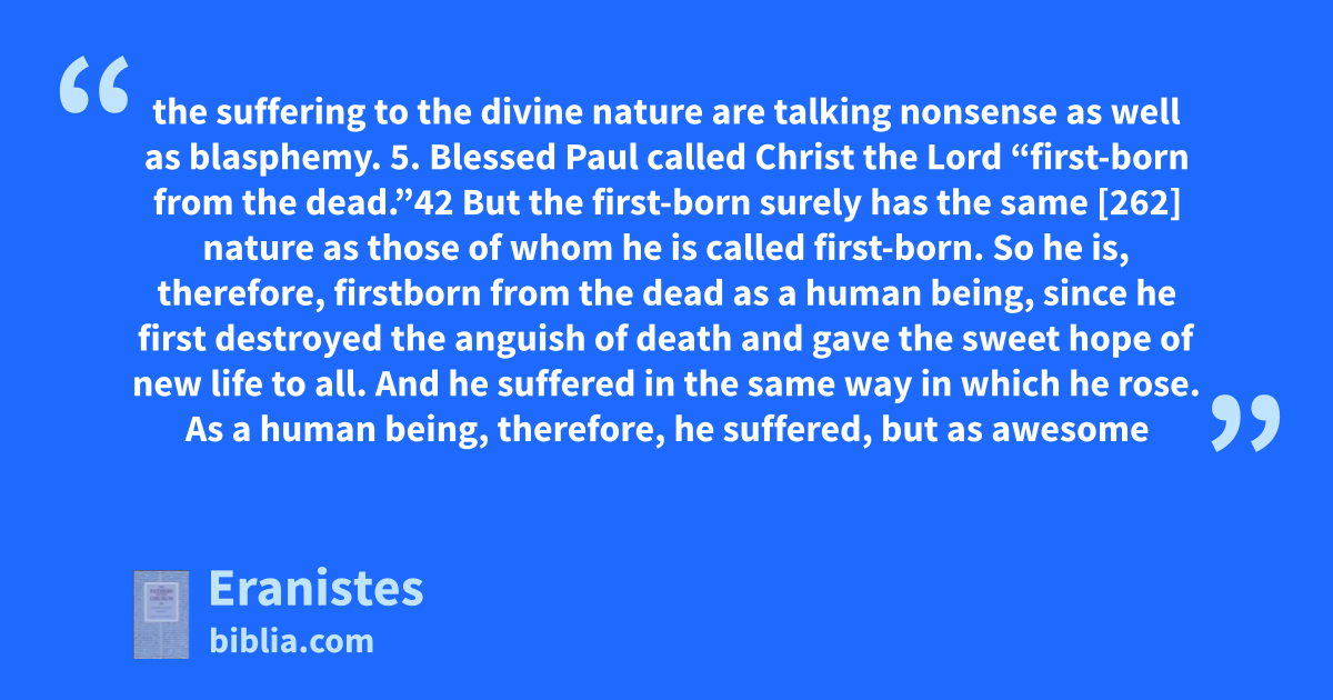 the suffering to the divine nature are talking nonsense as well as blasphemy. 5. Blessed Paul called Christ the Lord “first-born from the dead.”42 But the first-born surely has the same [262] nature as those of whom he is called first-born. So he is, therefore, firstborn from the dead as a human being, since he first destroyed the anguish of death and gave the sweet hope of new life to all. And he suffered in the same way in which he rose. As a human being, therefore, he suffered, but as awesome