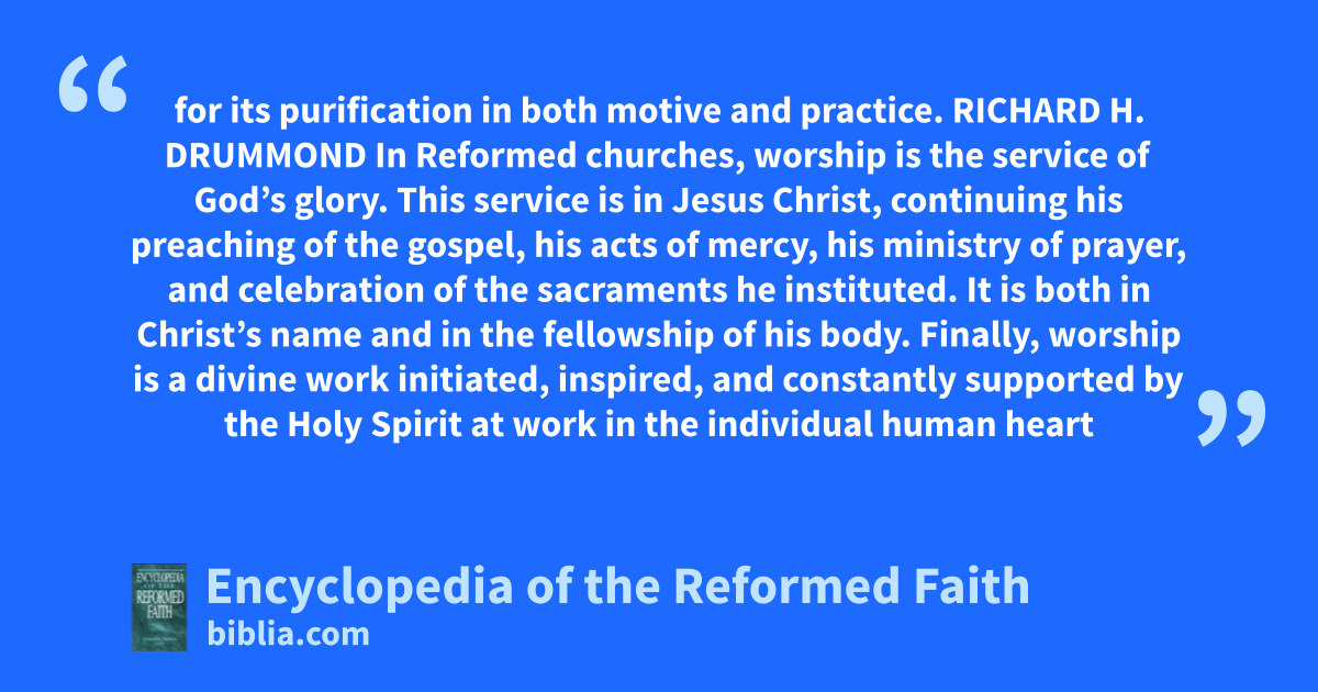 for its purification in both motive and practice. RICHARD H. DRUMMOND In Reformed churches, worship is the service of God’s glory. This service is in Jesus Christ, continuing his preaching of the gospel, his acts of mercy, his ministry of prayer, and celebration of the sacraments he instituted. It is both in Christ’s name and in the fellowship of his body. Finally, worship is a divine work initiated, inspired, and constantly supported by the Holy Spirit at work in the individual human heart