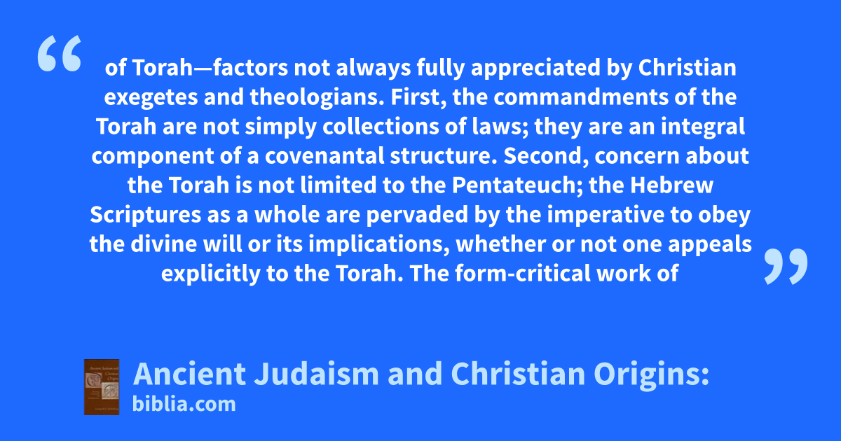 of Torah—factors not always fully appreciated by Christian exegetes and theologians. First, the commandments of the Torah are not simply collections of laws; they are an integral component of a covenantal structure. Second, concern about the Torah is not limited to the Pentateuch; the Hebrew Scriptures as a whole are pervaded by the imperative to obey the divine will or its implications, whether or not one appeals explicitly to the Torah. The form-critical work of