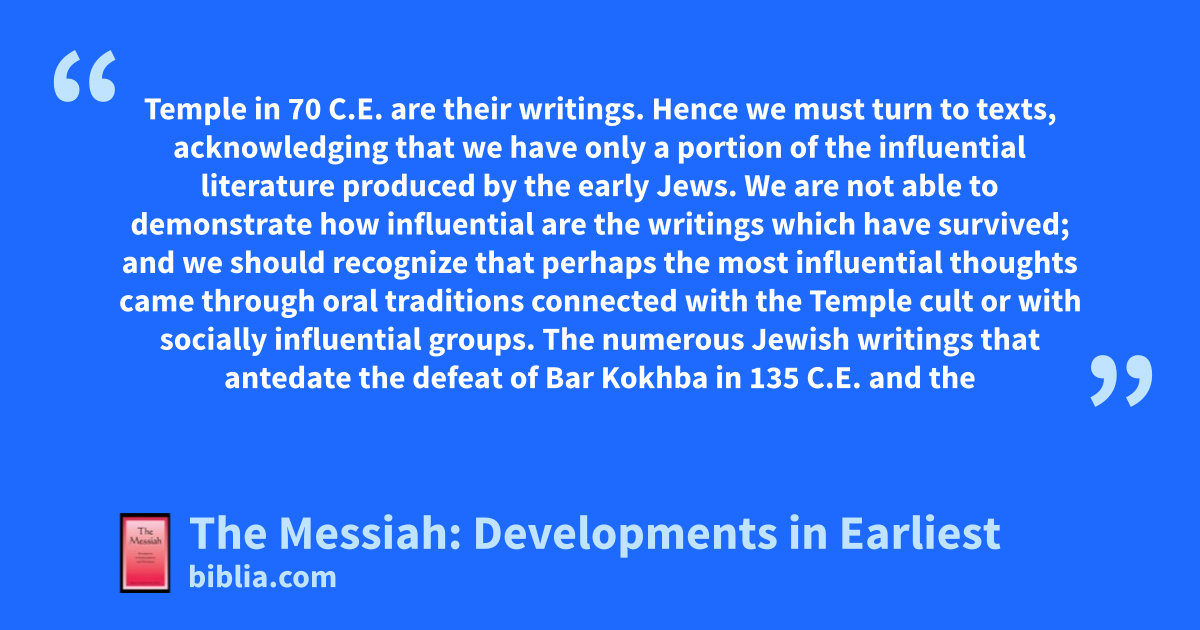 Temple in 70 C.E. are their writings. Hence we must turn to texts, acknowledging that we have only a portion of the influential literature produced by the early Jews. We are not able to demonstrate how influential are the writings which have survived; and we should recognize that perhaps the most influential thoughts came through oral traditions connected with the Temple cult or with socially influential groups. The numerous Jewish writings that antedate the defeat of Bar Kokhba in 135 C.E. and the