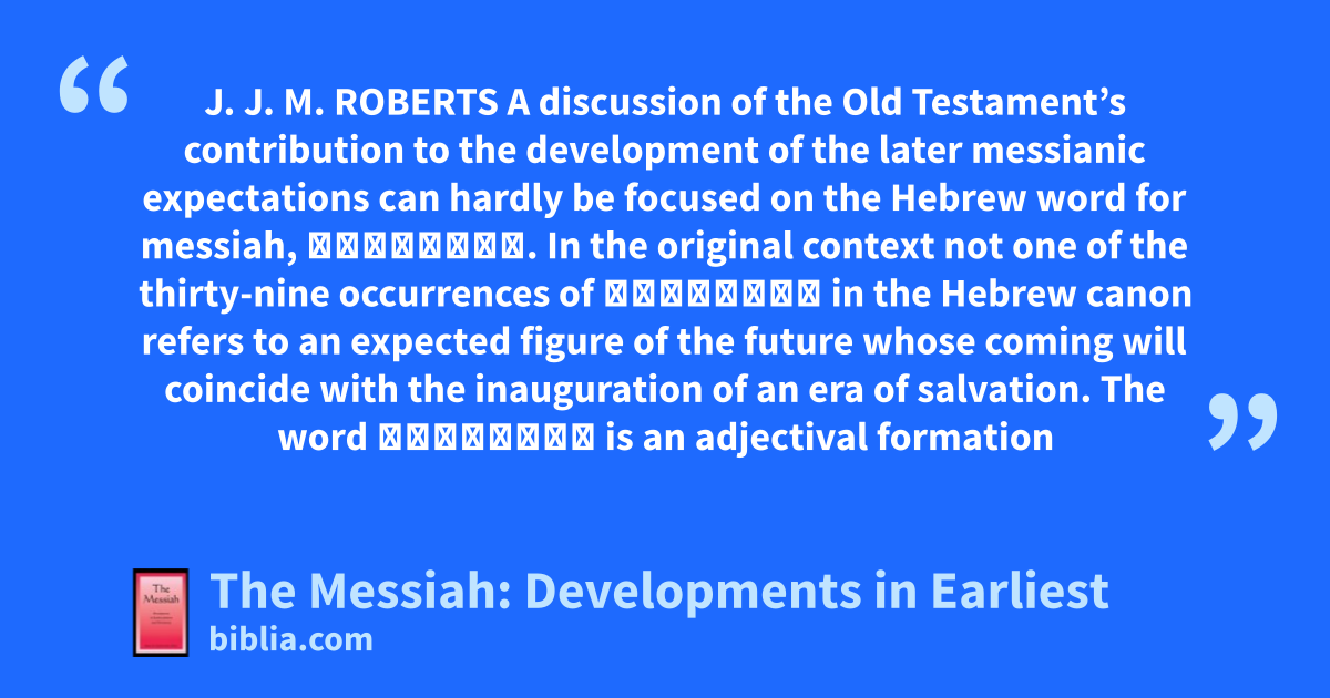 J. J. M. ROBERTS A discussion of the Old Testament’s contribution to the development of the later messianic expectations can hardly be focused on the Hebrew word for messiah, מָשִׁיחַ. In the original context not one of the thirty-nine occurrences of מָשִׁיחַ in the Hebrew canon refers to an expected figure of the future whose coming will coincide with the inauguration of an era of salvation. The word מָשִׁיחַ is an adjectival formation