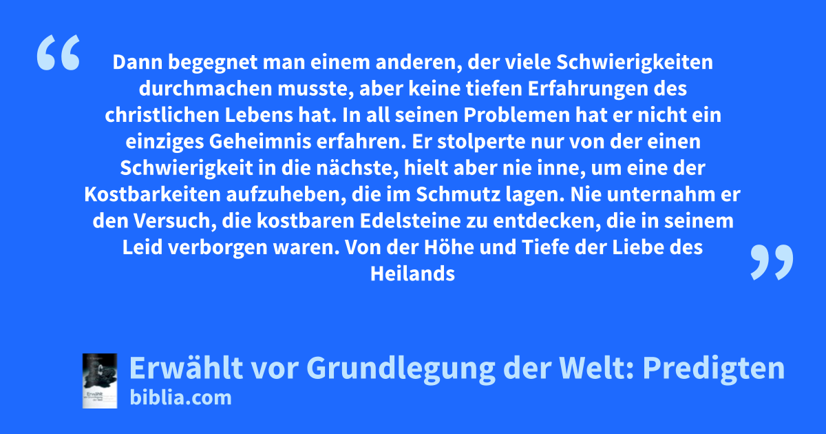 Dann begegnet man einem anderen, der viele Schwierigkeiten durchmachen musste, aber keine tiefen Erfahrungen des christlichen Lebens hat. In all seinen Problemen hat er nicht ein einziges Geheimnis erfahren. Er stolperte nur von der einen Schwierigkeit in die nächste, hielt aber nie inne, um eine der Kostbarkeiten aufzuheben, die im Schmutz lagen. Nie unternahm er den Versuch, die kostbaren Edelsteine zu entdecken, die in seinem Leid verborgen waren. Von der Höhe und Tiefe der Liebe des Heilands
