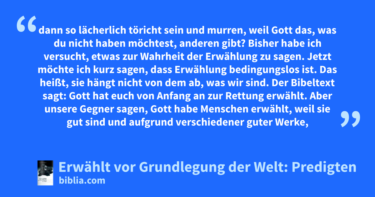 dann so lächerlich töricht sein und murren, weil Gott das, was du nicht haben möchtest, anderen gibt? Bisher habe ich versucht, etwas zur Wahrheit der Erwählung zu sagen. Jetzt möchte ich kurz sagen, dass Erwählung bedingungslos ist. Das heißt, sie hängt nicht von dem ab, was wir sind. Der Bibeltext sagt: Gott hat euch von Anfang an zur Rettung erwählt. Aber unsere Gegner sagen, Gott habe Menschen erwählt, weil sie gut sind und aufgrund verschiedener guter Werke,