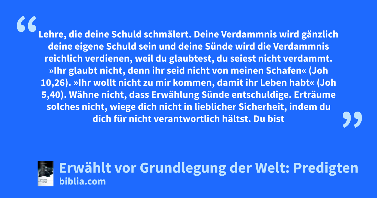 Lehre, die deine Schuld schmälert. Deine Verdammnis wird gänzlich deine eigene Schuld sein und deine Sünde wird die Verdammnis reichlich verdienen, weil du glaubtest, du seiest nicht verdammt. »Ihr glaubt nicht, denn ihr seid nicht von meinen Schafen« (Joh 10,26). »Ihr wollt nicht zu mir kommen, damit ihr Leben habt« (Joh 5,40). Wähne nicht, dass Erwählung Sünde entschuldige. Erträume solches nicht, wiege dich nicht in lieblicher Sicherheit, indem du dich für nicht verantwortlich hältst. Du bist