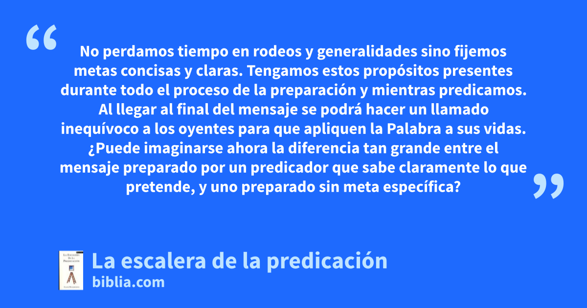 No perdamos tiempo en rodeos y generalidades sino fijemos metas concisas y claras. Tengamos estos propósitos presentes durante todo el proceso de la preparación y mientras predicamos. Al llegar al final del mensaje se podrá hacer un llamado inequívoco a los oyentes para que apliquen la Palabra a sus vidas. ¿Puede imaginarse ahora la diferencia tan grande entre el mensaje preparado por un predicador que sabe claramente lo que pretende, y uno preparado sin meta específica?