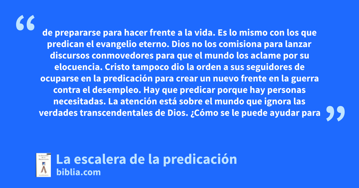de prepararse para hacer frente a la vida. Es lo mismo con los que predican el evangelio eterno. Dios no los comisiona para lanzar discursos conmovedores para que el mundo los aclame por su elocuencia. Cristo tampoco dio la orden a sus seguidores de ocuparse en la predicación para crear un nuevo frente en la guerra contra el desempleo. Hay que predicar porque hay personas necesitadas. La atención está sobre el mundo que ignora las verdades transcendentales de Dios. ¿Cómo se le puede ayudar para