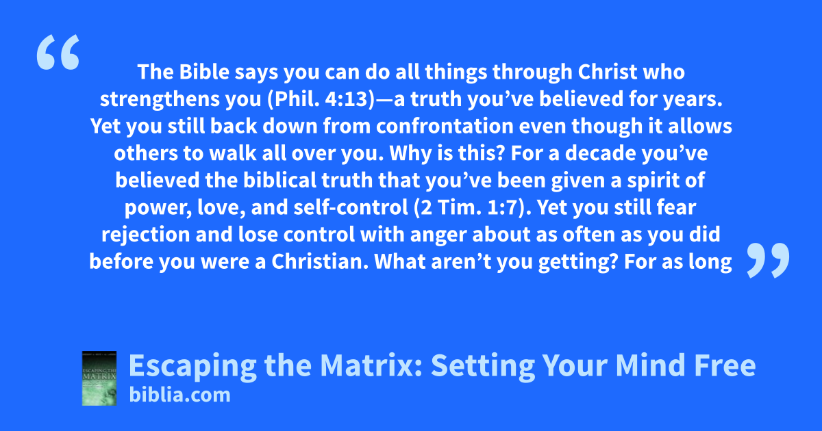 The Bible says you can do all things through Christ who strengthens you (Phil. 4:13)—a truth you’ve believed for years. Yet you still back down from confrontation even though it allows others to walk all over you. Why is this? For a decade you’ve believed the biblical truth that you’ve been given a spirit of power, love, and self-control (2 Tim. 1:7). Yet you still fear rejection and lose control with anger about as often as you did before you were a Christian. What aren’t you getting? For as long
