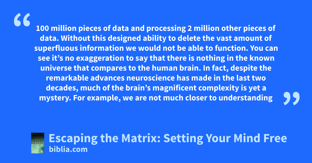 100 million pieces of data and processing 2 million other pieces of data. Without this designed ability to delete the vast amount of superfluous information we would not be able to function. You can see it’s no exaggeration to say that there is nothing in the known universe that compares to the human brain. In fact, despite the remarkable advances neuroscience has made in the last two decades, much of the brain’s magnificent complexity is yet a mystery. For example, we are not much closer to understanding