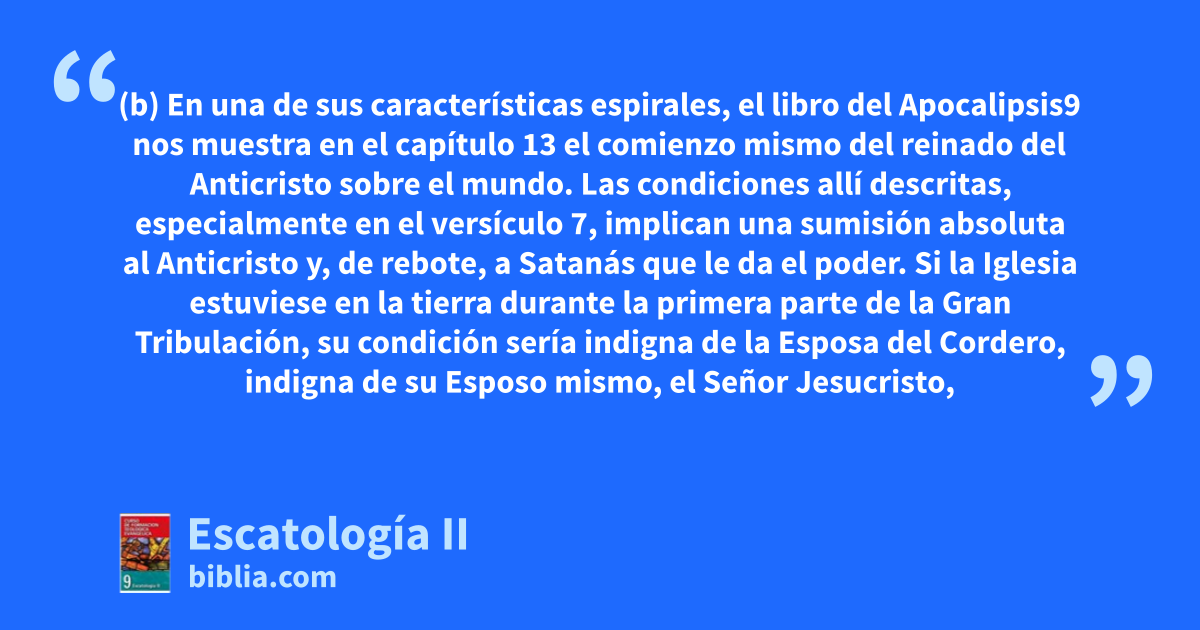 (b) En una de sus características espirales, el libro del Apocalipsis9 nos muestra en el capítulo 13 el comienzo mismo del reinado del Anticristo sobre el mundo. Las condiciones allí descritas, especialmente en el versículo 7, implican una sumisión absoluta al Anticristo y, de rebote, a Satanás que le da el poder. Si la Iglesia estuviese en la tierra durante la primera parte de la Gran Tribulación, su condición sería indigna de la Esposa del Cordero, indigna de su Esposo mismo, el Señor Jesucristo,