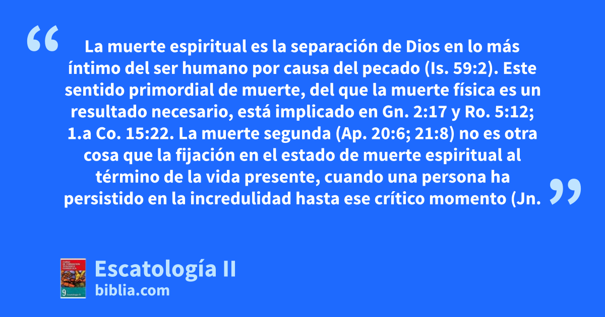 La muerte espiritual es la separación de Dios en lo más íntimo del ser humano por causa del pecado (Is. 59:2). Este sentido primordial de muerte, del que la muerte física es un resultado necesario, está implicado en Gn. 2:17 y Ro. 5:12; 1.a Co. 15:22. La muerte segunda (Ap. 20:6; 21:8) no es otra cosa que la fijación en el estado de muerte espiritual al término de la vida presente, cuando una persona ha persistido en la incredulidad hasta ese crítico momento (Jn.