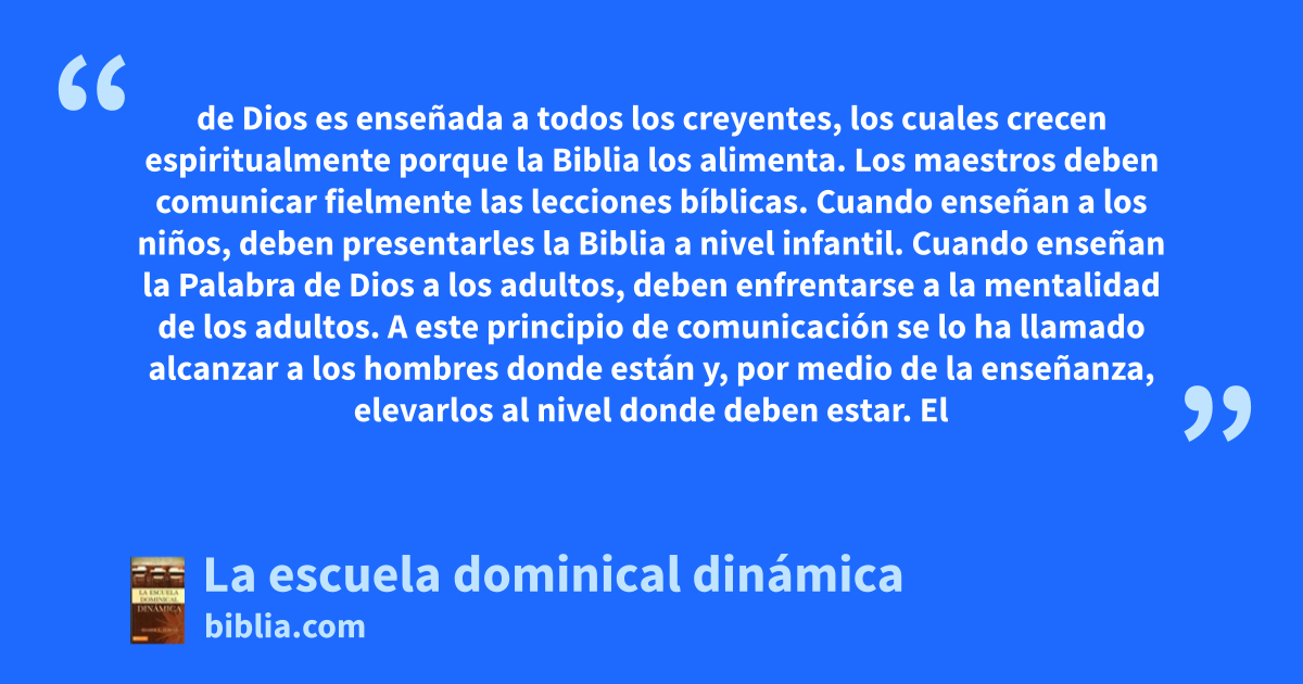 de Dios es enseñada a todos los creyentes, los cuales crecen espiritualmente porque la Biblia los alimenta. Los maestros deben comunicar fielmente las lecciones bíblicas. Cuando enseñan a los niños, deben presentarles la Biblia a nivel infantil. Cuando enseñan la Palabra de Dios a los adultos, deben enfrentarse a la mentalidad de los adultos. A este principio de comunicación se lo ha llamado alcanzar a los hombres donde están y, por medio de la enseñanza, elevarlos al nivel donde deben estar. El