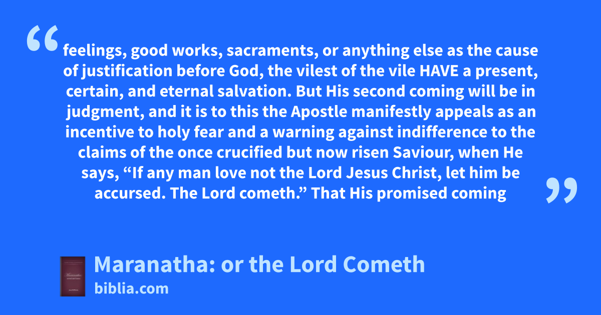 feelings, good works, sacraments, or anything else as the cause of justification before God, the vilest of the vile HAVE a present, certain, and eternal salvation. But His second coming will be in judgment, and it is to this the Apostle manifestly appeals as an incentive to holy fear and a warning against indifference to the claims of the once crucified but now risen Saviour, when He says, “If any man love not the Lord Jesus Christ, let him be accursed. The Lord cometh.” That His promised coming